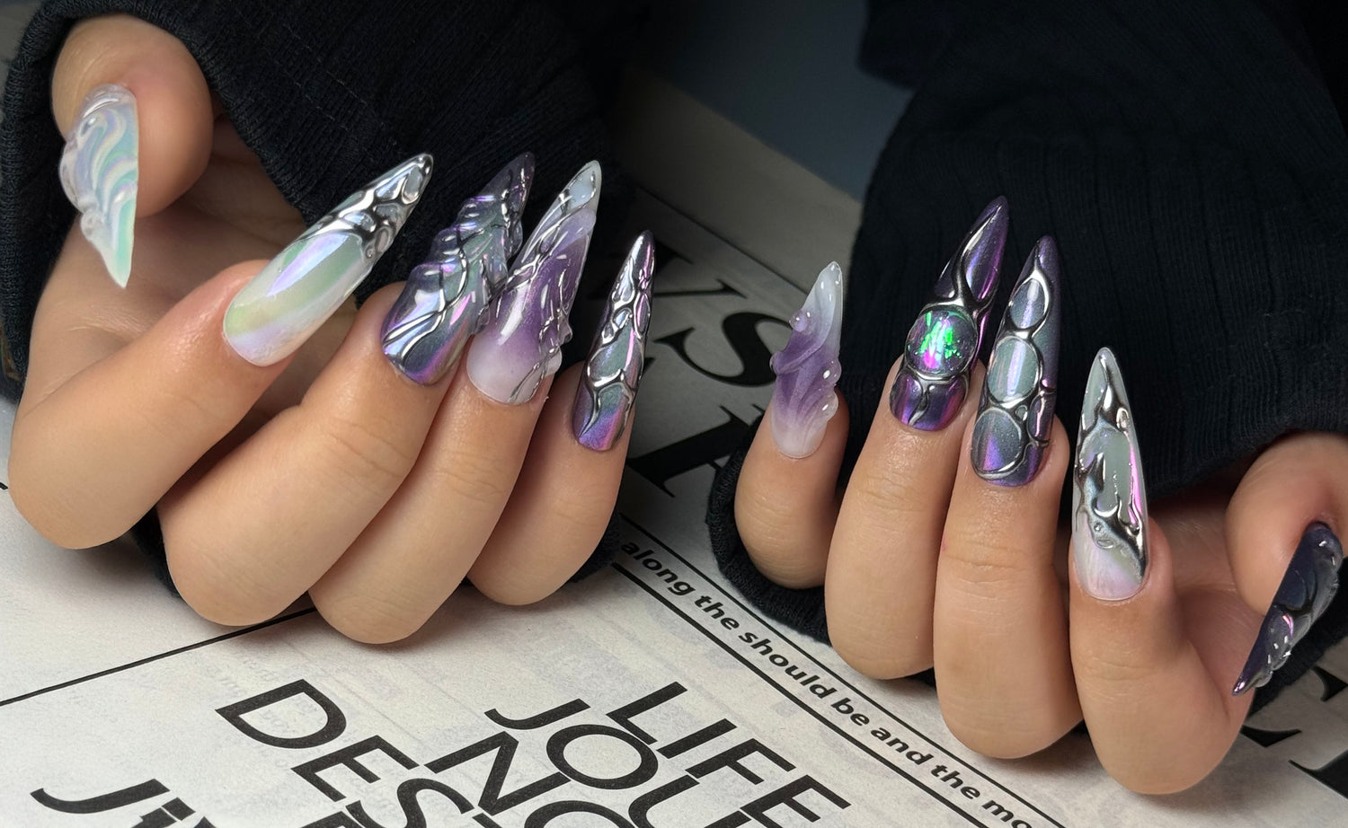 Prism Crush Press-On Nails – Iridescent Y2K Fake Nails with Chrome Details & Jelly Accents