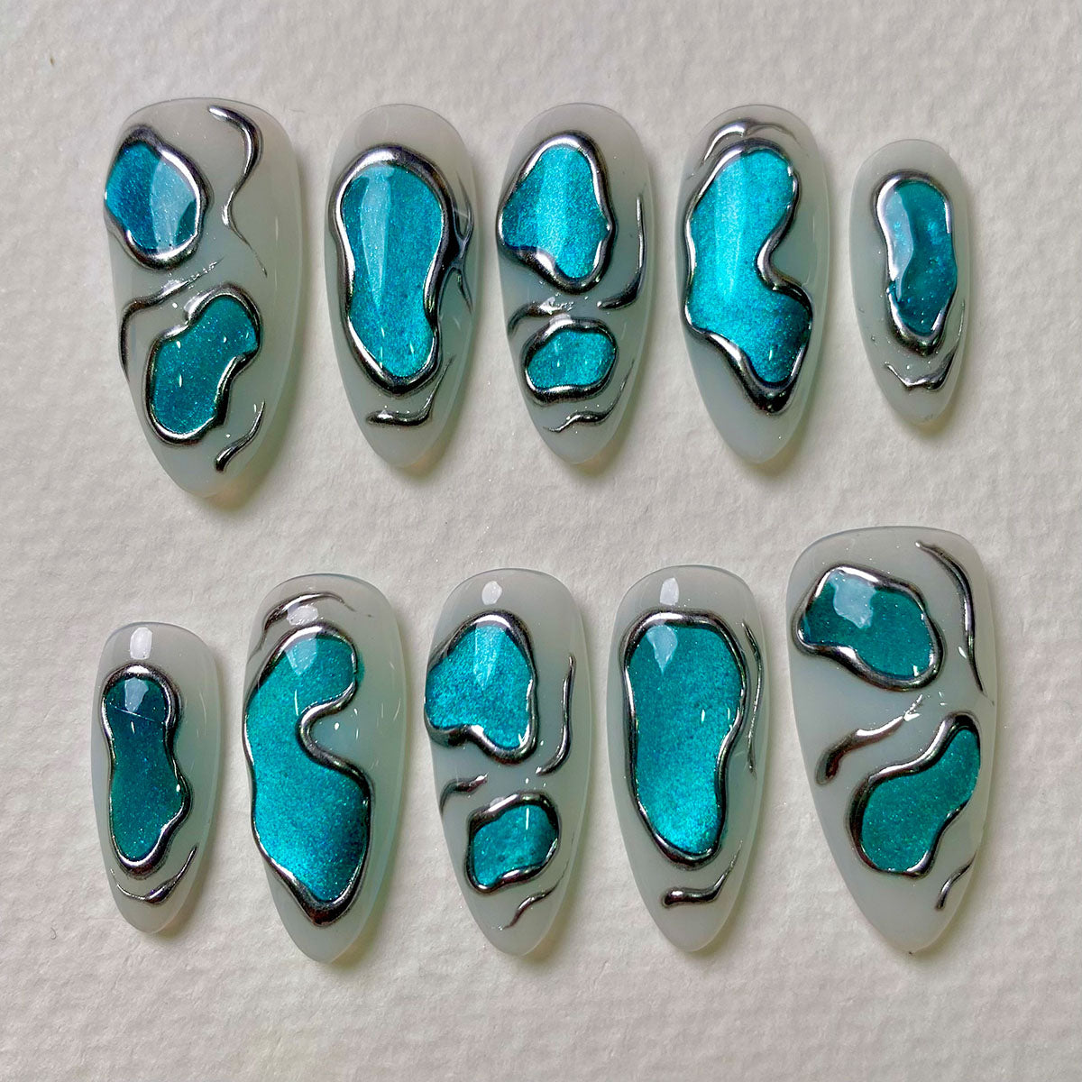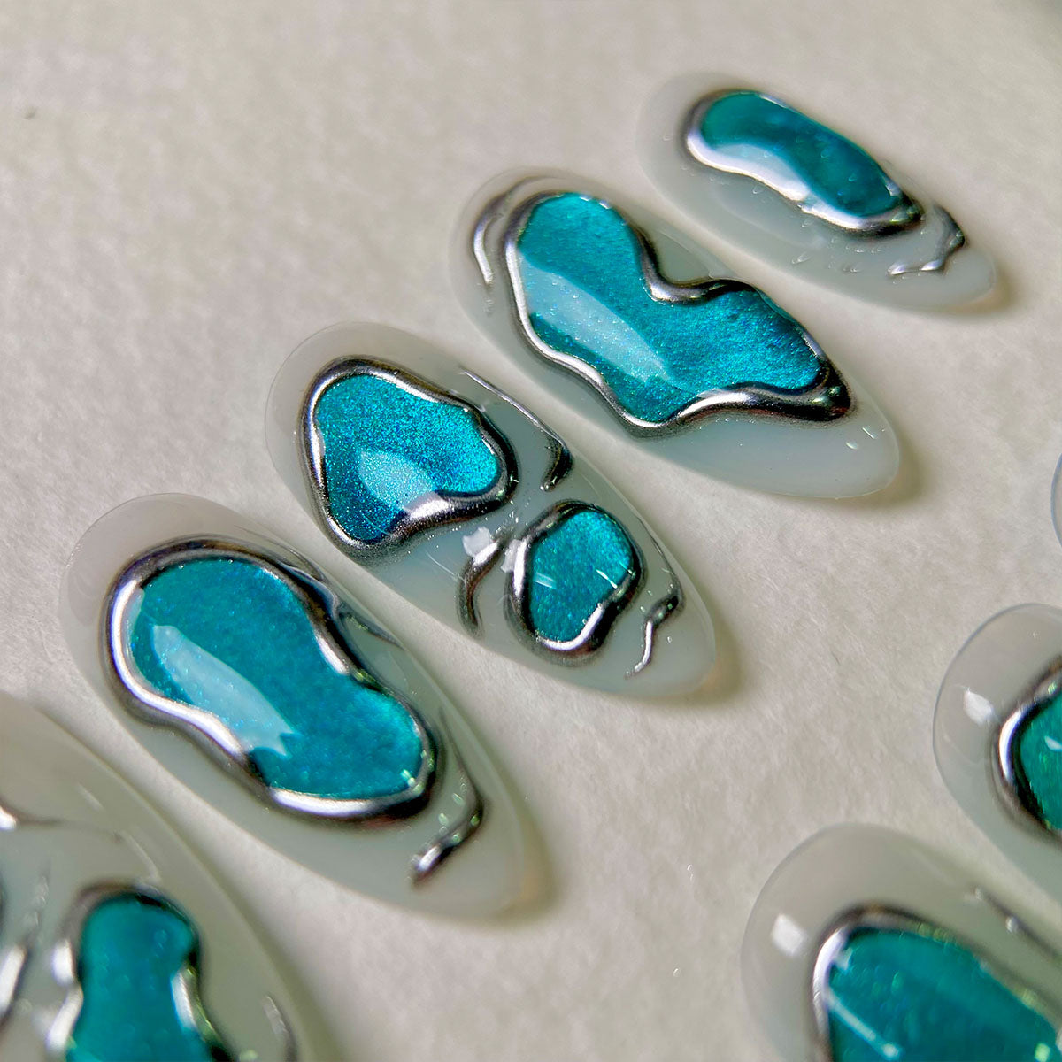 Dive into a dreamy sea of shine with these aqua chrome press-on nails. The soft white base sets off shimmering teal pools outlined in fluid silver, like sunlight reflecting on water. Perfect for a light, summery vibe with a touch of modern edge. Easy to wear, hard to forget.