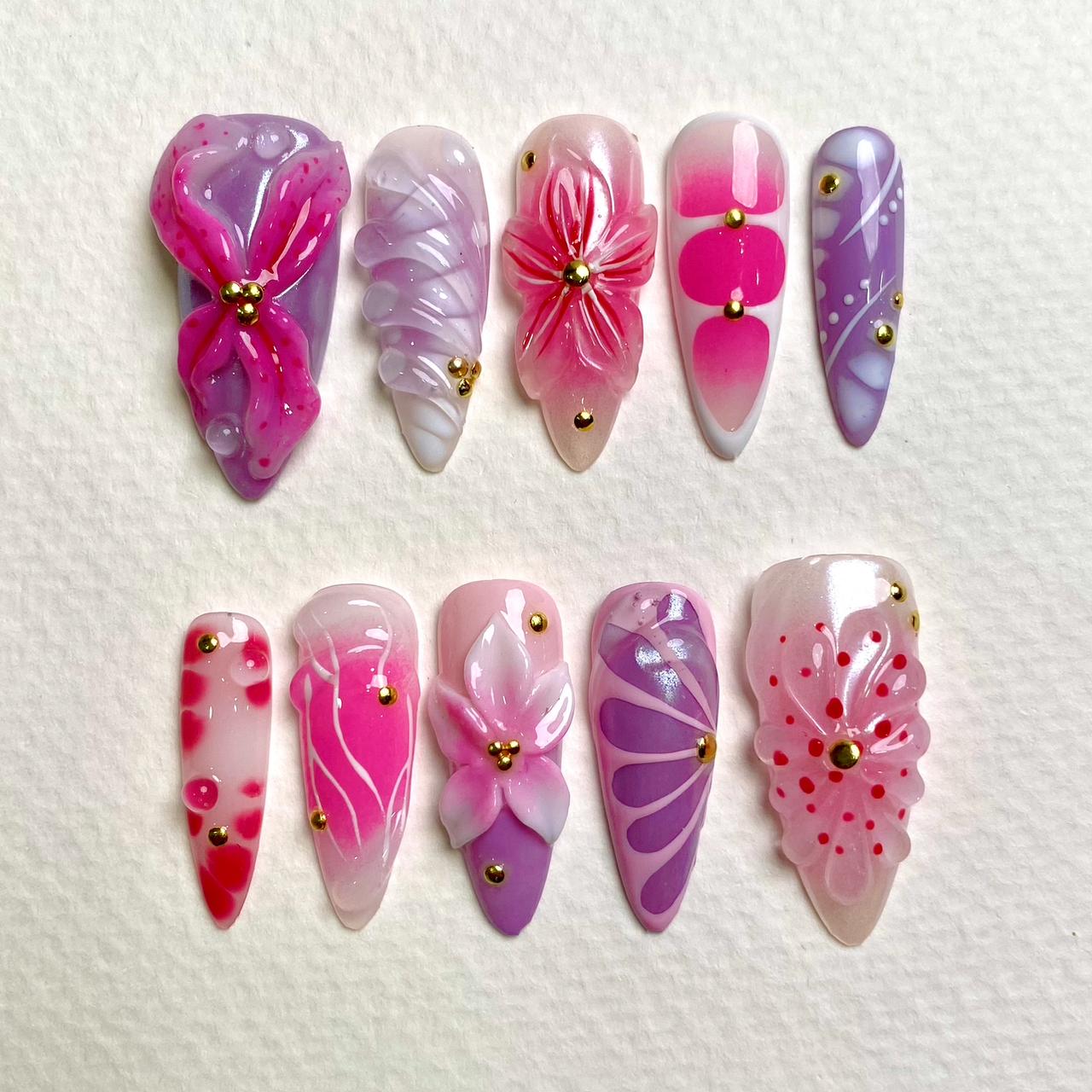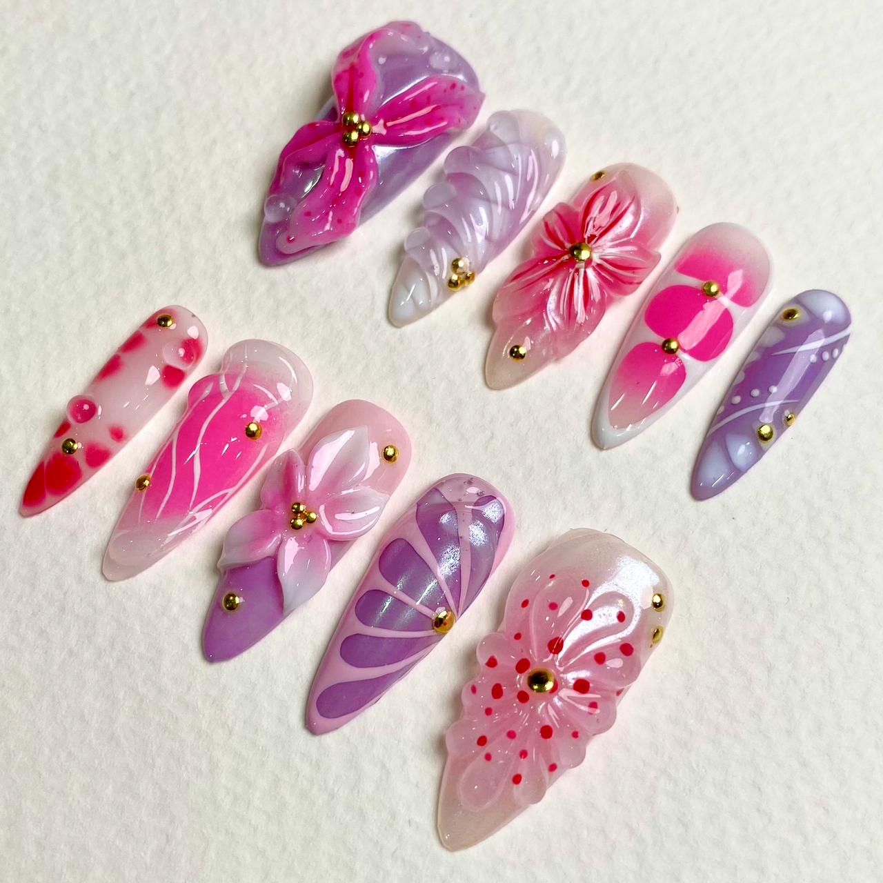 Let your sweet side bloom. This playful press-on nail set features glossy purple-pink gradients, 3D bows, and blooming florals with gold accents. A candy-colored dream for anyone who loves cute, eye-catching nails.