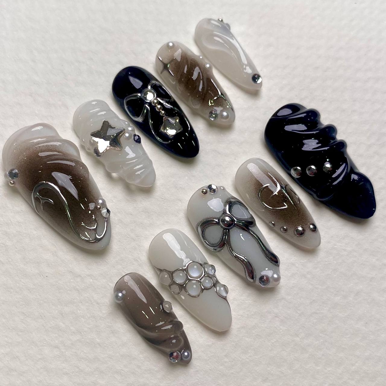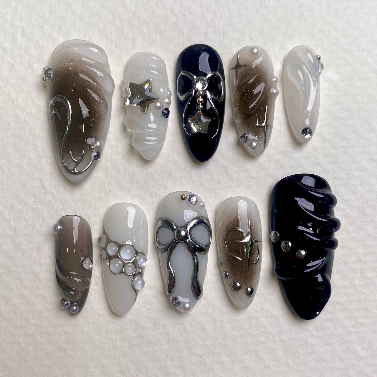 Wrap your fingertips in moody elegance. These grey-black press-on nails feature silver chrome bows, sculpted stars, and metallic pearls on a matte-to-gloss gradient base. The perfect gothic-glam look that whispers celestial beauty.
