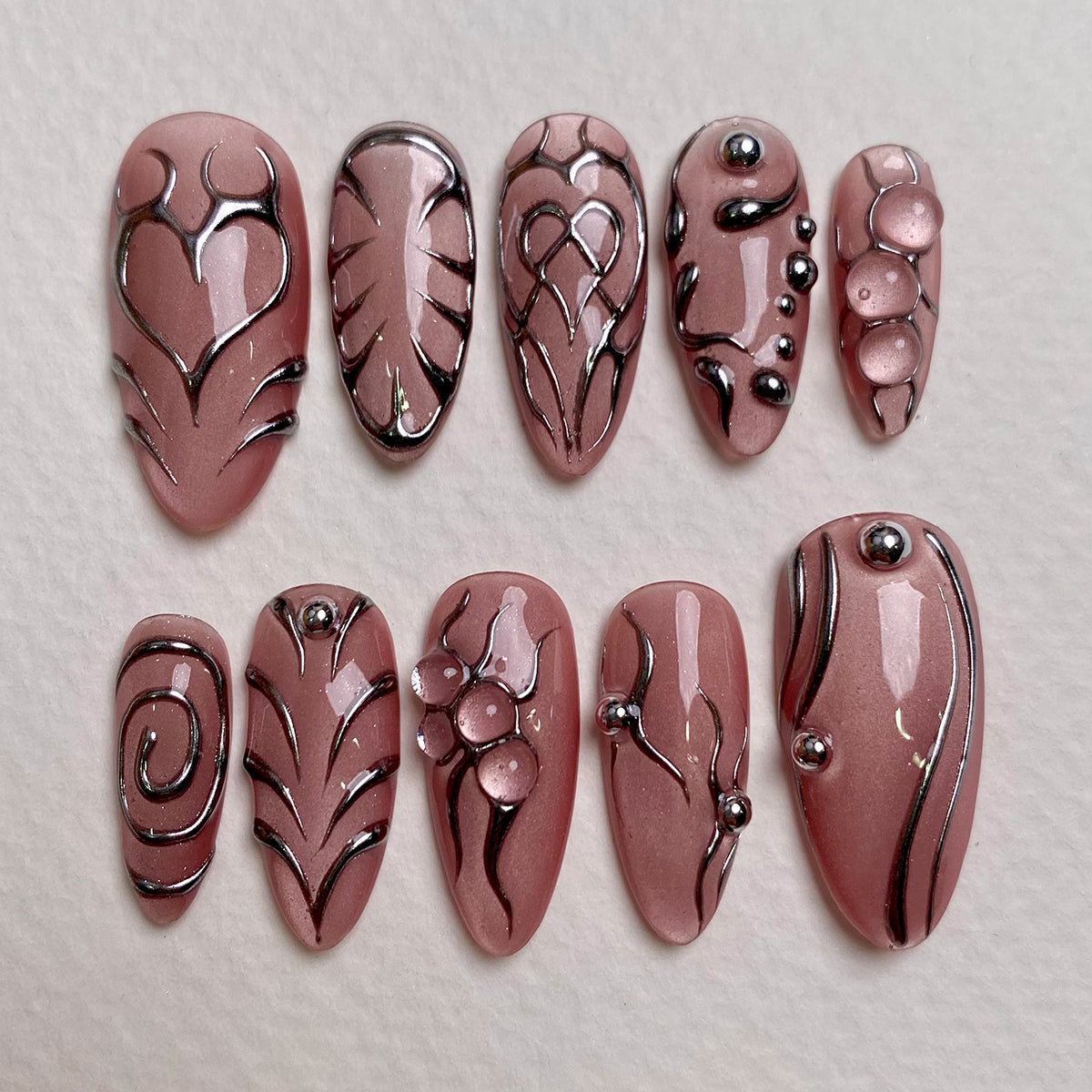 Let your fingertips glow with Rosé Catlight — shimmering pink cat eye press on nails with 3D chrome swirls, bubble accents, and heart motifs. These fake nails blend elegance and playfulness, perfect for brunch dates, selfies, or soft girl aesthetics. A dreamy choice for anyone who loves sparkly details with a gentle charm.